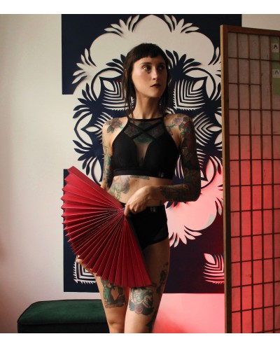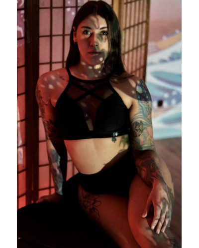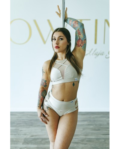 Top Pole Dance z siateczką na dekolcie i krzyżykiem z lamówek. Wycięte plecy z pięcioma lamówkami.