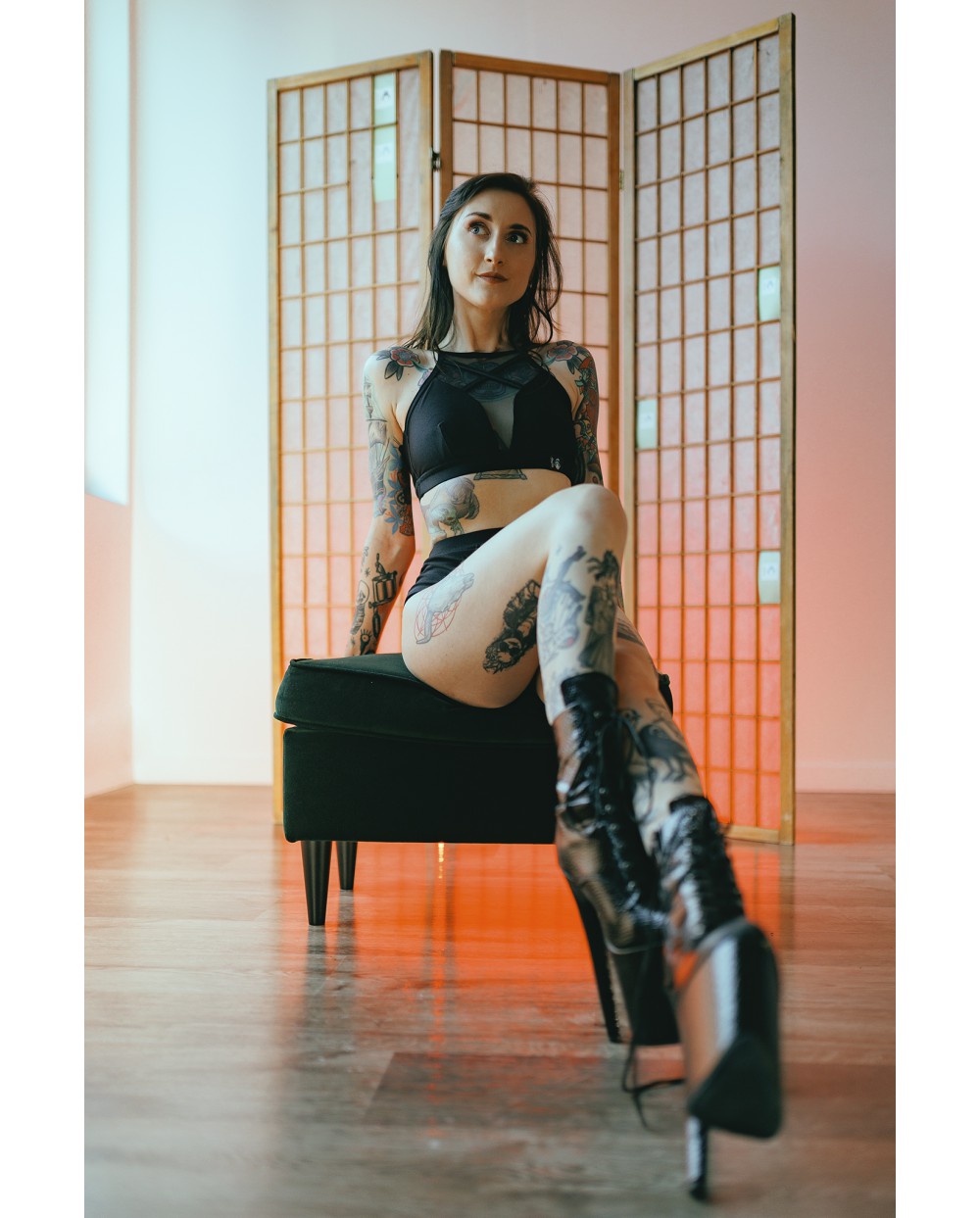 Top Pole Dance Nagako z siateczką na dekolcie i krzyżykiem z lamówek. Bardzo kobiecy, zmysłowy krój, idealny na exoticowe harce :) Prześwitująca siateczka z przodu odsłania część dekoltu. Jednocześnie zabudowany pod szyję krój sprawia, że nic nie odchyli się podczas ćwiczeń. Plecy zdobi pięć lamówek, które pięknie wyglądają i trzymają top na swoim miejscu. Top Nagako ma wszytą gumkę w pasku pod biustem. Pasek z gumką przeszyty jest elastycznym ściegiem, dzięki czemu gumka nie będzie się przekręcać. Top odszyty jest z lekko połyskującej lycry, przeznaczonej specjalnie na stroje taneczne, i wykończony delikatną, szybkoschnącą podszewką. W topie przygotowane są "kieszonki" na wkładki, więc jeśli masz swoje ulubione, sprawdzone wkładki będziesz mogła ich użyć :) Jeśli nie, specjalne wkładki przeznaczone do strojów sportowych znajdziesz w zakładce Stroje Pole Dance - Akcesoria.